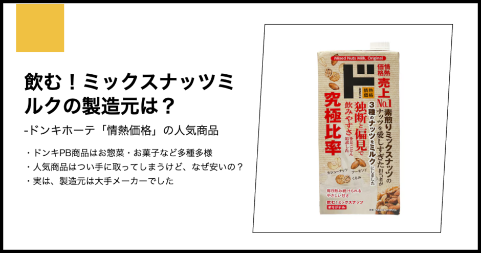 ドン・キホーテのプライベートブランドである情熱価格から登場し、健康志向のユーザーや植物性ミルク愛好家の間で大きな話題となっているのが飲む!ミックスナッツミルクです。アーモンド、カシューナッツ、ヘーゼルナッツを贅沢に使用したこの飲料が、一体どこのメーカーの技術によって支えられているのか。パッケージの裏側に隠された流通の仕組みと、その圧倒的なクオリティを実現する専門的な背景を調査しました。