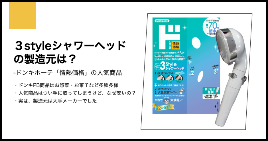 3styleシャワーヘッドの製造元が、家庭用品のプロである株式会社オリエントであり、専門メーカーの確かな技術とドン・キホーテの流通改革によって驚きの価値が生まれていることが分かりました。